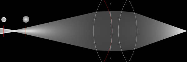 In the next scenario we only changed the diameter of the inner lens housing (red). Right when we start at the center of the film-plane we already notice a difference to the previous scenario. Unlike before the shape of the projection now only depends on the outer diameter. Only when we get to the very outer edge of the image the inner lens housing obstructs part of the outer radius.